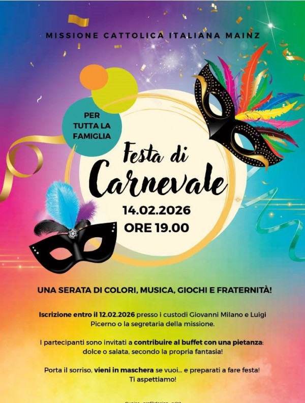 Festa del carnevale per tutti: sabato 14 febbraio, alle ore 19.00 al bar della Missione. Invitiamo gli adulti e le famiglie con i bambini. Oltre la musica e animazione della festa per i grandi, si prevedono anche giochi e intrattenimenti per i più piccoli. Chi desidera partecipare, si prenoti entro giovedì 12 febbraio presso i nostri custodi Giovanni Milano e Luigi Picerno o telefonando alla segreteria della Missione. I partecipanti alla festa sono invitati a portare una pietanza da condividere per un buffet insieme.