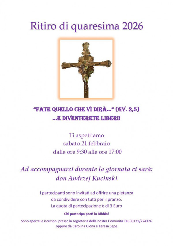 Ritiro di Quaresima: si terrà sabato 21 febbraio. Il predicatore, don Andrzej Kuciński da Bonn ci farà riflettere sul tema Fate quello che vi dirà (Gv 2,5)…e diventerete liberi! . Inizio alle ore 9.30. Conclusione con la S. Messa delle ore 16.00. Quota di partecipazione è di 3 Euro. Le iscrizioni presso la segreteria della Missione o da Teresa Sepe e Carolina Giona.